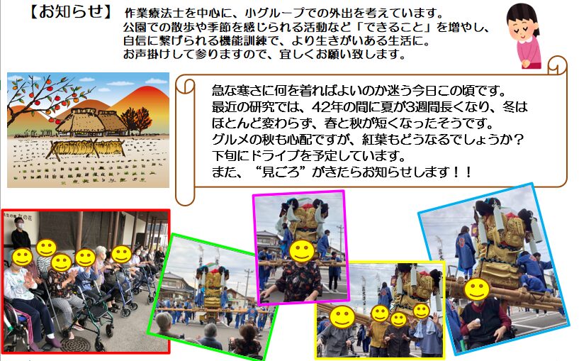 また、11月より作業療法士2名が中心となり、小グループでの外出を考えています!