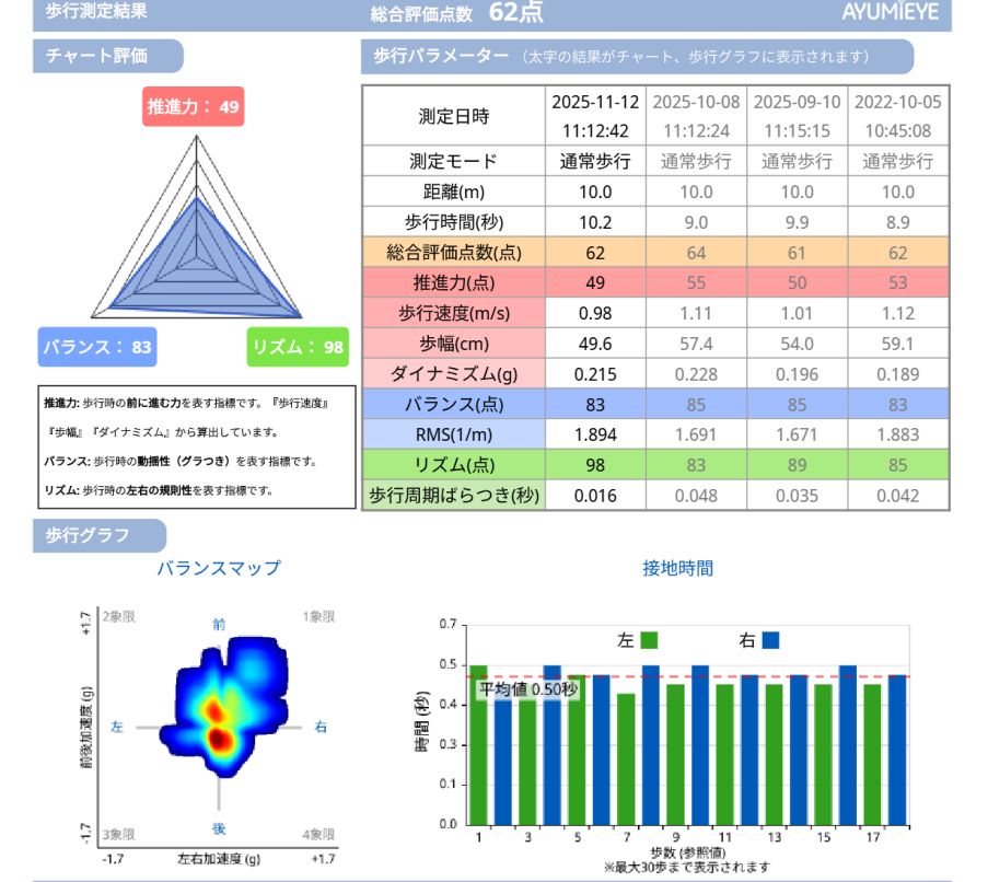 ※AYUMI EYEの測定は10m「何も持たない」「杖」「歩行器」などを使用し、歩いてもらっています