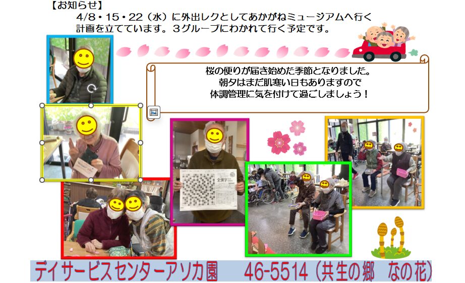 4月のアソカデイ 2026.04.02 アソカデイ 新居浜市にあります、すいよう会デイサービスセンターアソカ園です。 みなさん、春らしくなってきましたね。 桜もチューリップも次々に咲いています! お花見ドライブに忙しい季節です。 お花の具合によるため、カレンダーには記載していませんが、月初はお花見ドライブを予定してます!! また今月は、水曜日を中心に新居浜駅横の「あかがねミュージアム」にもお邪魔する予定です。 太鼓台をみたり、360°シアターに入ってみたり、ちょっと散策してみませんか? 追加のご利用も気軽にお声掛けください!! できるを自信に🌟 前の記事